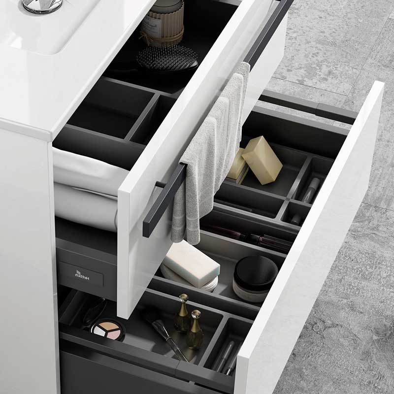 Développez Meuble suspendu de salle de bain modèle Milan avec lavabo, comptoir en céramique blanche. Miroir dressing optionnel.