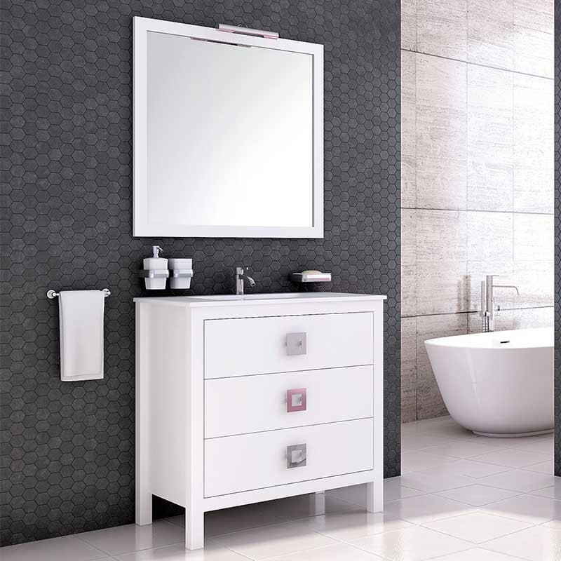 Développez Les meubles à l'étage pour la salle de bains de Vienne modèle avec 3 tiroirs et un grand lavabo de comptoir en céramique. Miroir avec cadre en bois et led optionnel.