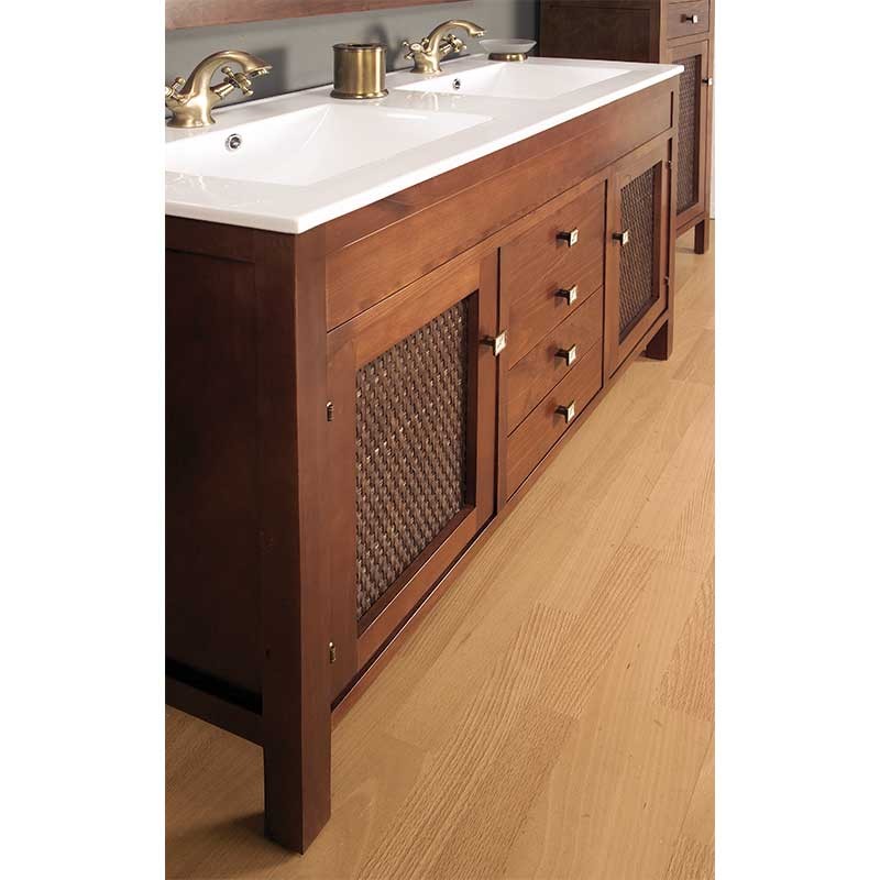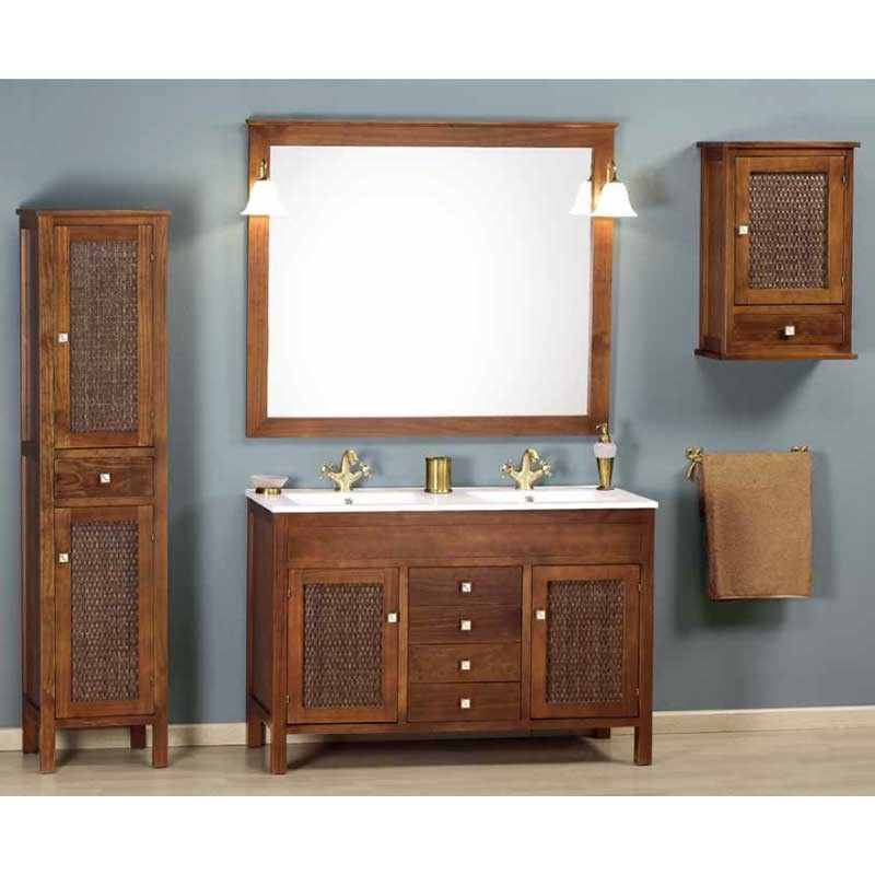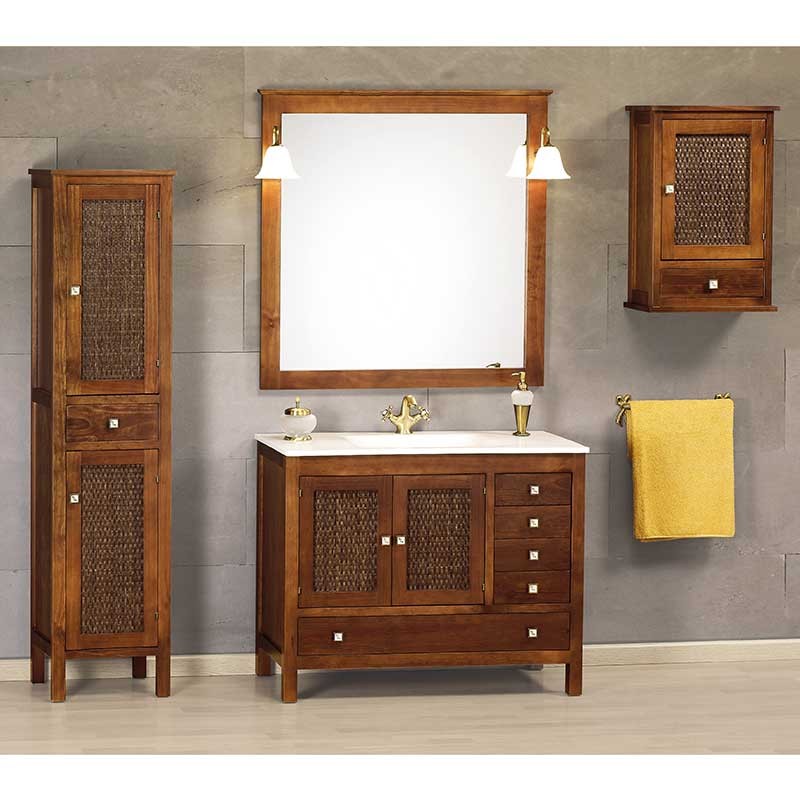 Développez Meuble de salle de bain de style classique/rustique modèle Jaca couleur noyer avec lavabo comptoir en céramique. Miroir, appliques led et meuble auxiliaire à accrocher en option.