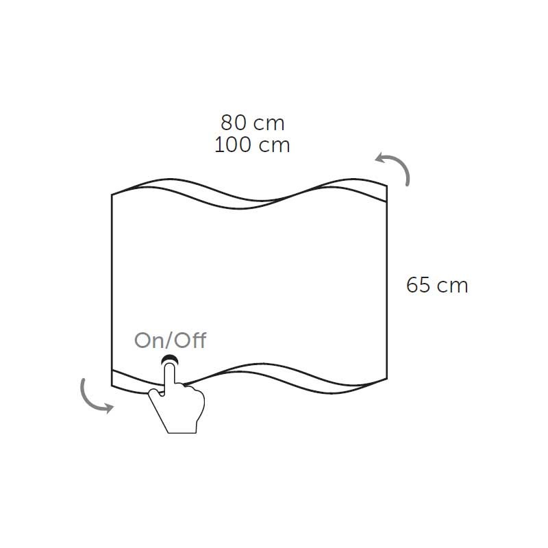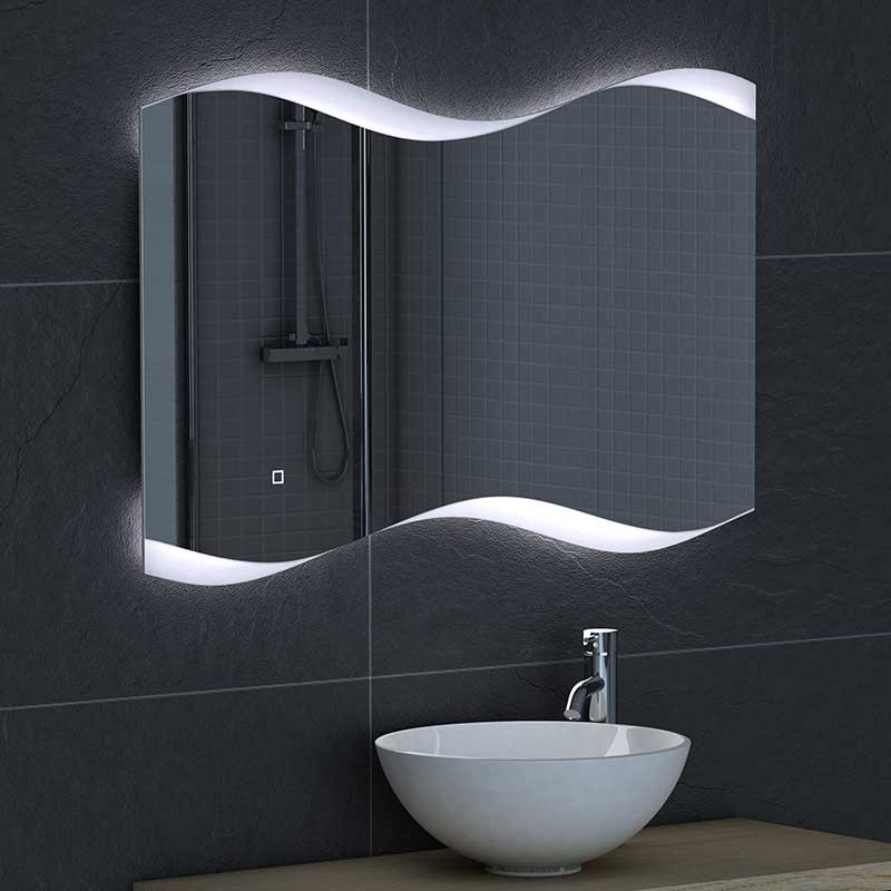 Développez Miroir led de salle de bains modèle de Modène avec le verre de 5 mm d'épaisseur, zone de glaces, désembuage, capteur de contact et d'ambiance d'éclairage à led.