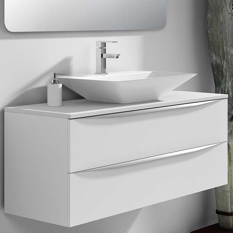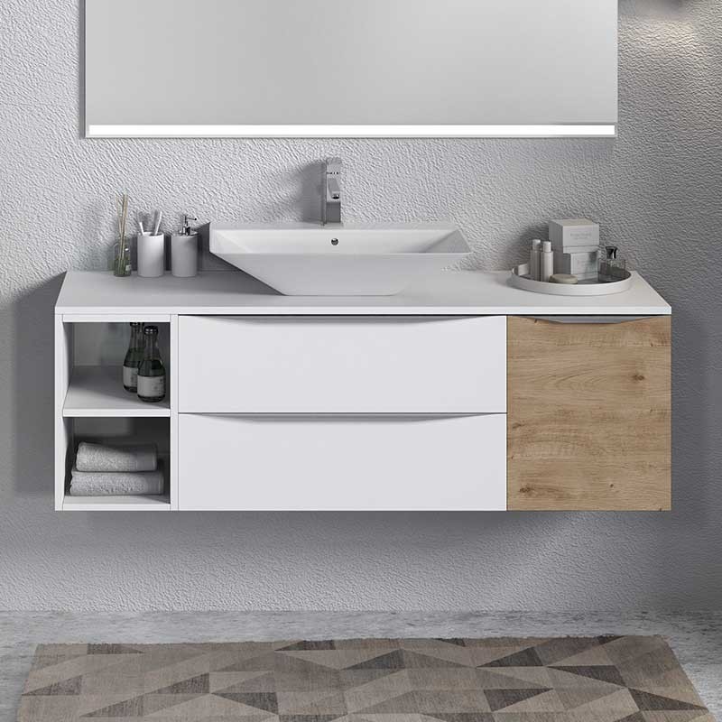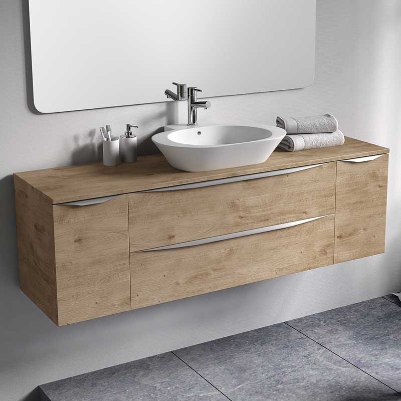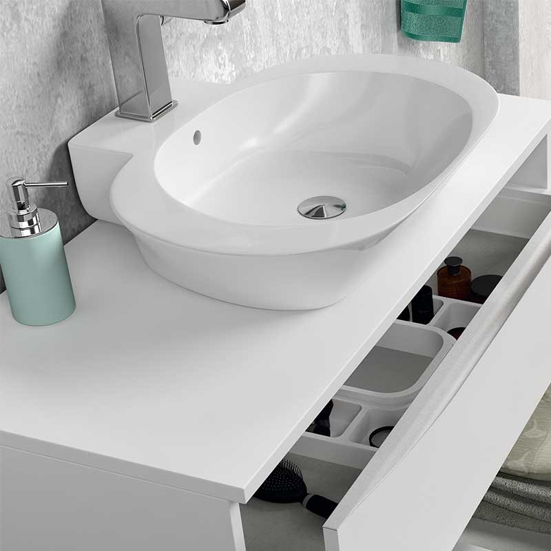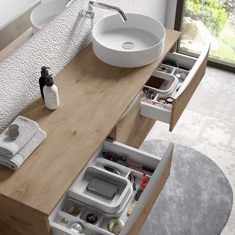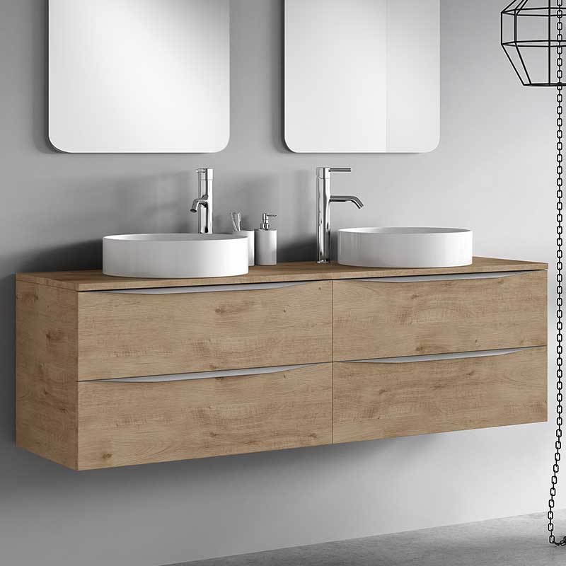 Développez Bouchon de comptoir modèle Landes pour la salle de bains meubles en MDF hydrofuge épaisseur 19 mm plaqué avec le laser. Fini mat blanc ou chêne naturel à choisir.