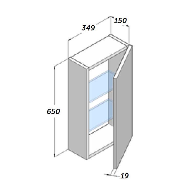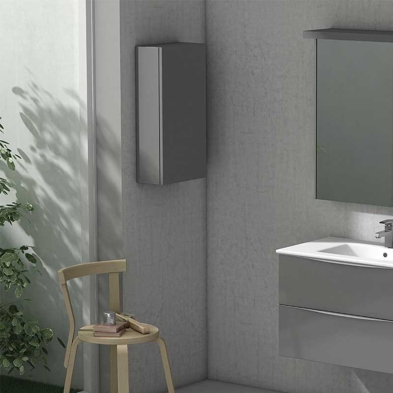 Développez Meuble à accrocher sur le mur modèle Landes avec 1 porte, charnières avec système de fermeture amortie et 2 tablettes en verre à l'intérieur.