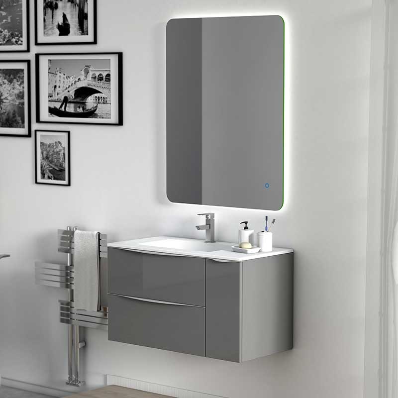 Développez Meuble suspendu de salle de bains modèle Landes avec 2 tiroirs et un grand lavabo de comptoir à Surface Solide modèle d'Ambre. Miroir à led optionnel.