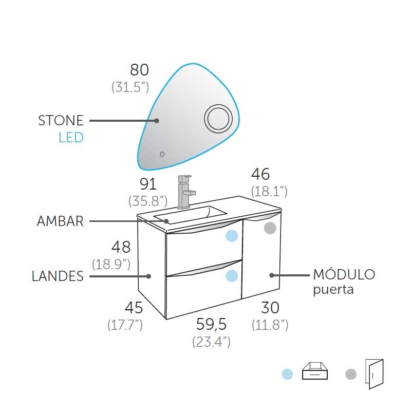 Développez Ensemble modulaire pour salle de bain modèle Landes formé par 1 meuble suspendu de l'60 cm 1 30 cm 1 porte et lavabo de comptoir de Surface Solide.
