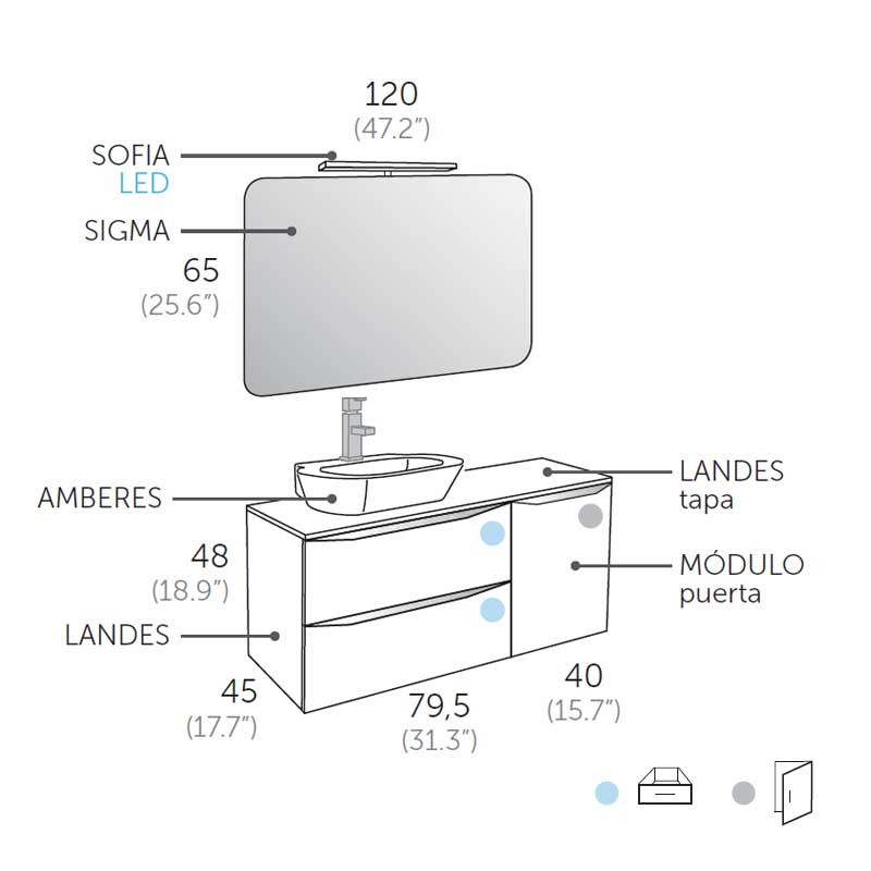 Développez Ensemble modulaire pour salle de bain modèle Landes formé par 1 meuble suspendu 80 cm 1 40 cm 1 porte et lavabo en céramique sobreencimera.