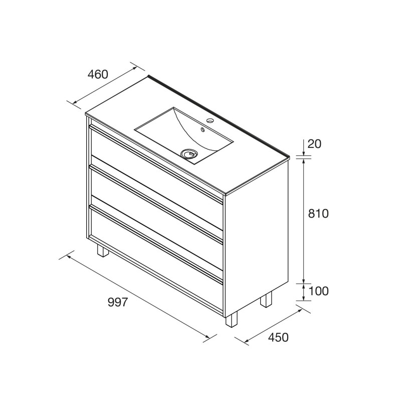 Le meuble de salle de bain suspendu est disponible en varias mesure (600, 800, 850, 1000 ou 1200 mm de large et 45 mm de profondeur), et caractéristiques trois tiroirs qui offrent un grand espace de rangement.