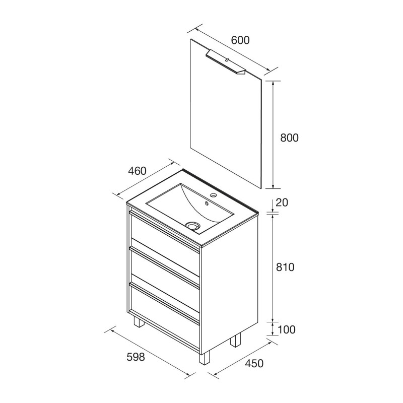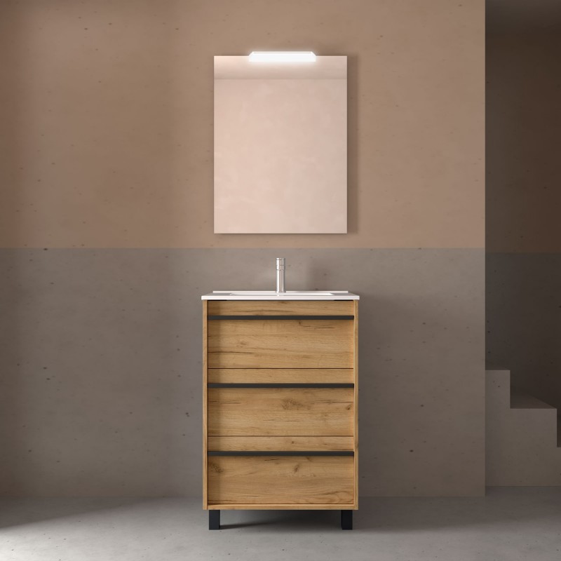 Composé de Armoire à 3 tiroirs Attila, évier en porcelaine, miroir et applique murale à LED. Inclus.