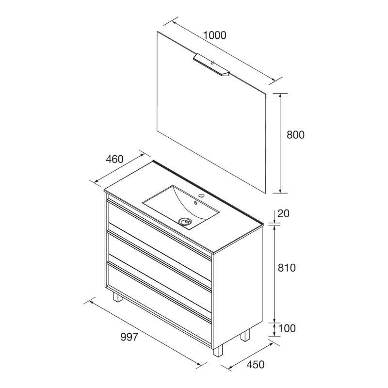 Composé de Armoire à 3 tiroirs Attila, évier en porcelaine, miroir et applique murale à LED. Inclus.