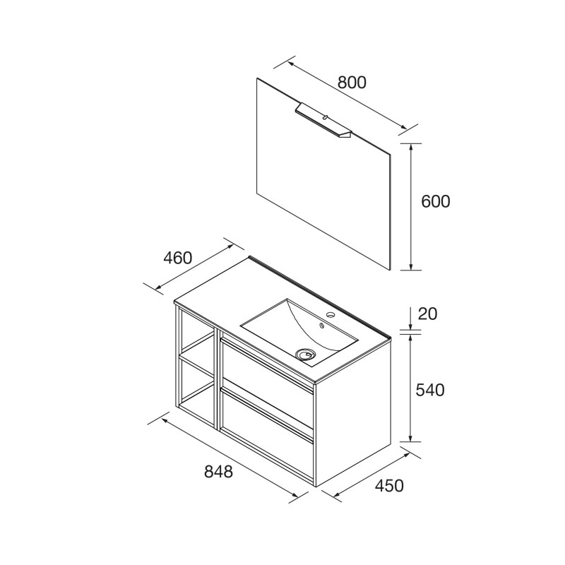 Les Armoire de toilette suspendue ATTILA, d'une largeur de 850 mm et d'une profondeur de 45 mm, se compose d'un meuble de salle de bain de 600 mm plus une coquette servie en kit 250 mr.