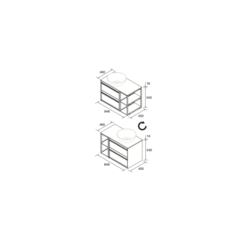 Fabriqué avec panneau de particules laminé de 16 mm, le mobilier présente façades et côtés de haute qualité avec bords en PVC et colle PUR. Le comptoir, dans la même finition que le meuble, offre une surface élégante et fonctionnelle pour votre salle de bain.