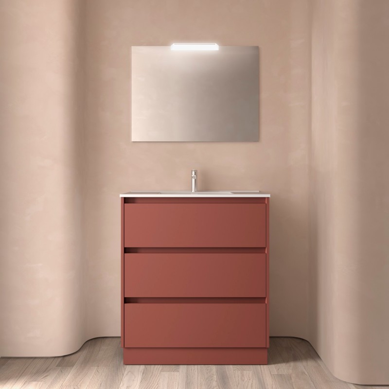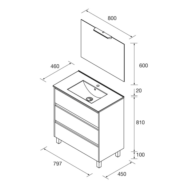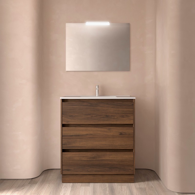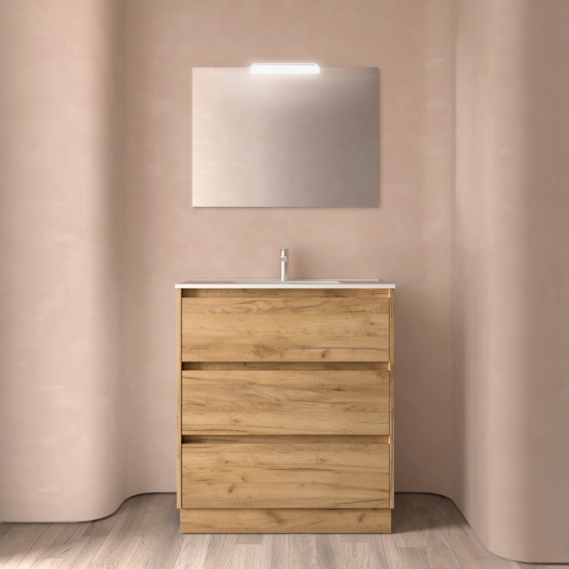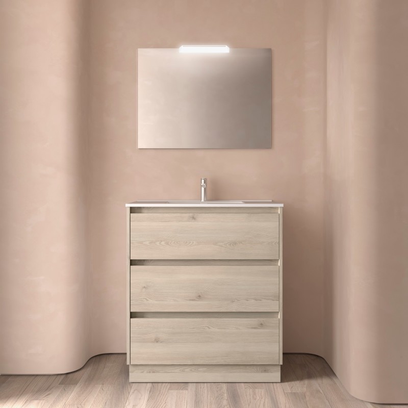 Composé de Armoire à 3 tiroirs Noja, évier en porcelaine, miroir et applique murale à LED. Inclus lot de 4 pattes luminosité anodisée de 100 mm.