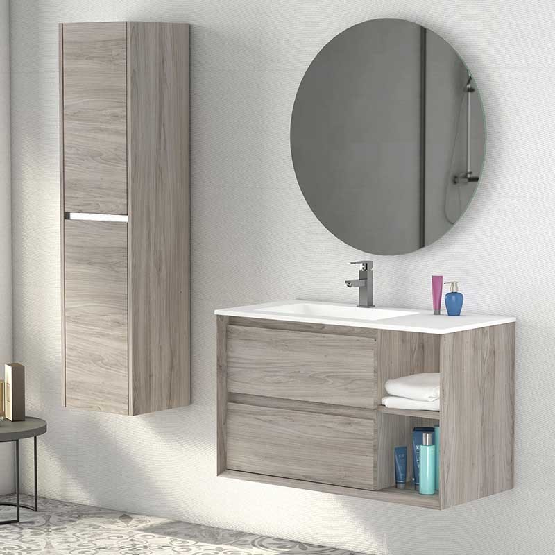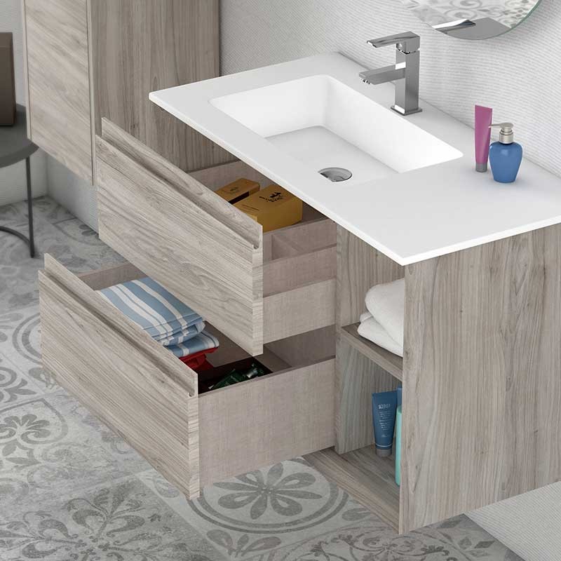 Développez Meuble suspendu de salle de bains modèle de Trou avec 2 grands tiroirs et 1 étagère, lavabo et comptoir de Surface Solide. Miroir et meuble colonne auxiliaire optionnel.