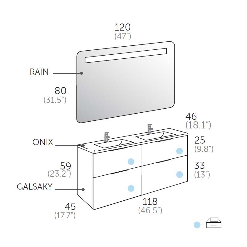 Développez Meuble composé de salle de bains modèle Galsaky formé par 2 porte-à-faux meubles de 60 cm avec 2 tiroirs chacun, plus un lavabo de comptoir double en céramique. Miroir à led optionnel.