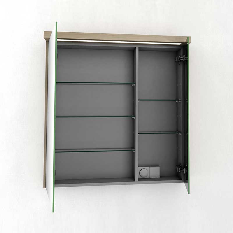 Développez Meubles de dressing salle de bain 2 portes avec miroir à double face modèle de ligne d'Horizon, à la charnière du système soft-fermeture, et 5 tablettes en verre à l'intérieur.