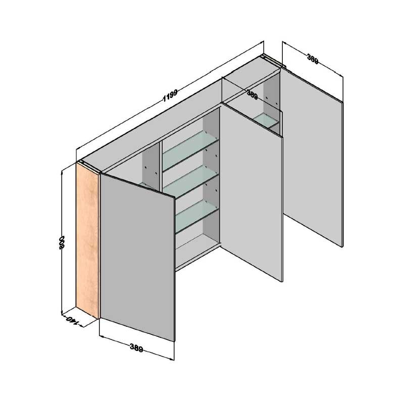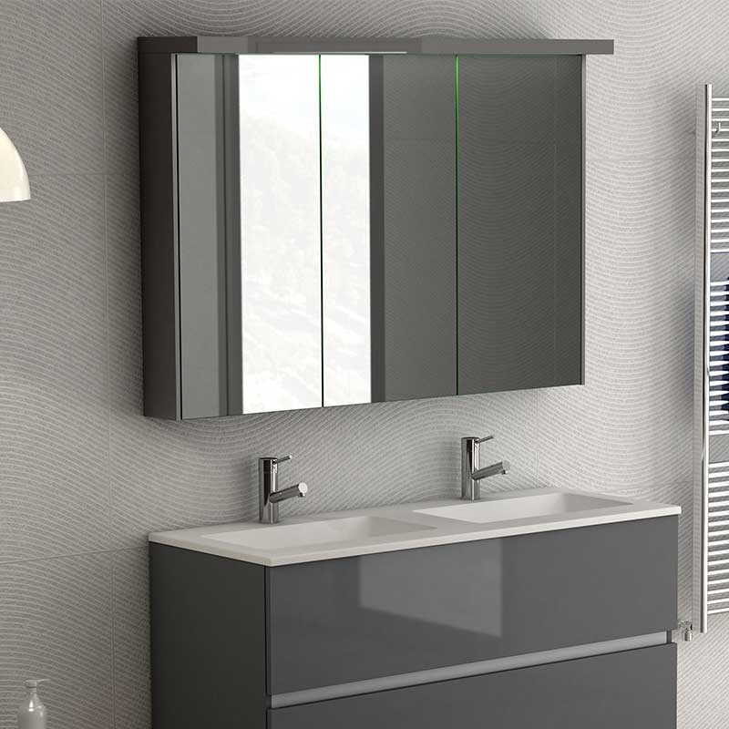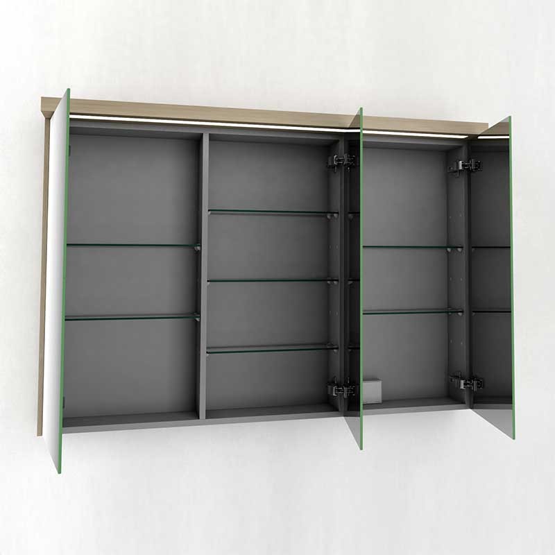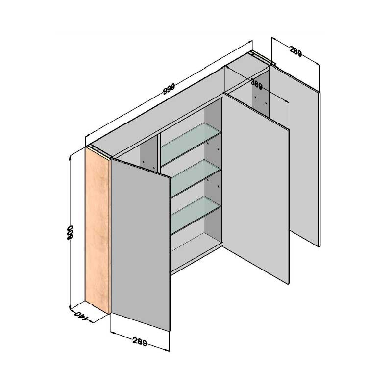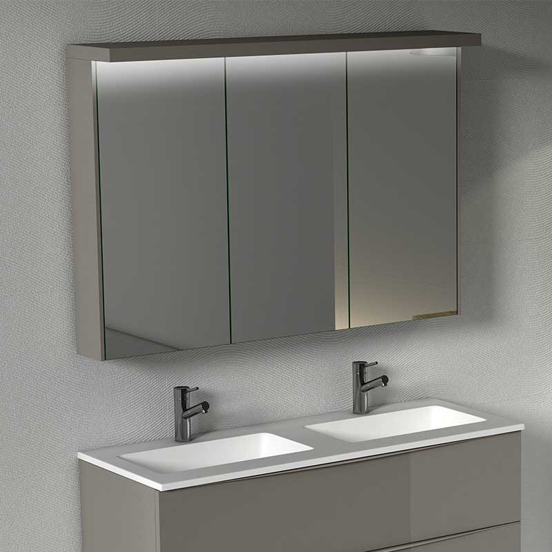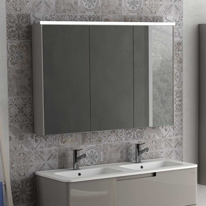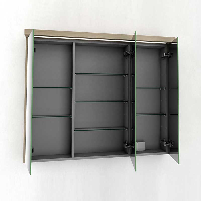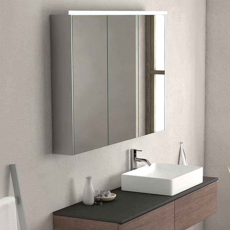 Développez Meubles de dressing salle de bain 3-modèle de porte Toits de la ville avec miroir double-face, à charnières avec système de fermeture amortie et 7 tablettes en verre à l'intérieur.